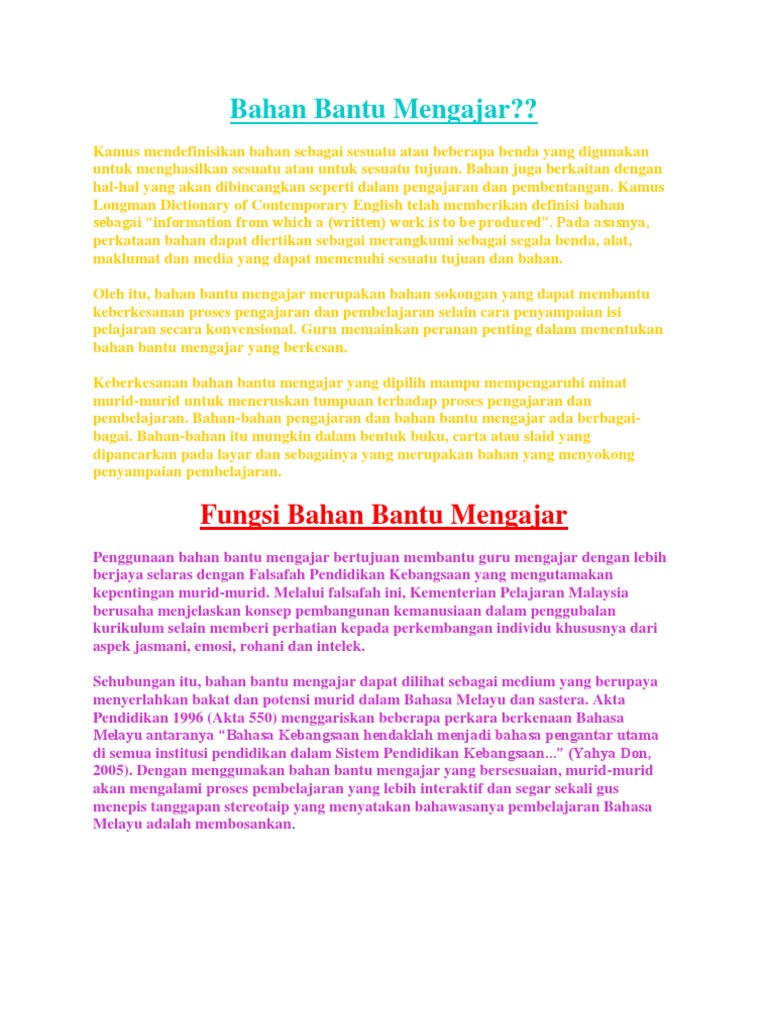Unduh sebagai DOCX PDF TXT atau baca online dari Scribd. Penggunaan bahan bantu mengajar BBM dalam kalangan guru di sekolah memberi kesan yang positif terhadap kecemerlangan akademik pelajar dan kaedah pengajaran guru itu sendiri. Bahan bantu mengajar memberi kesan kepada peningkatan kemahiran asas membaca dalam kalangan murid-murid pemulihan.
